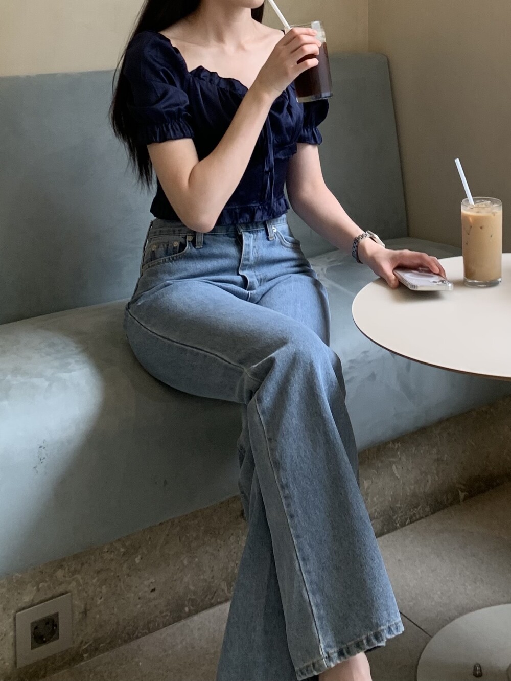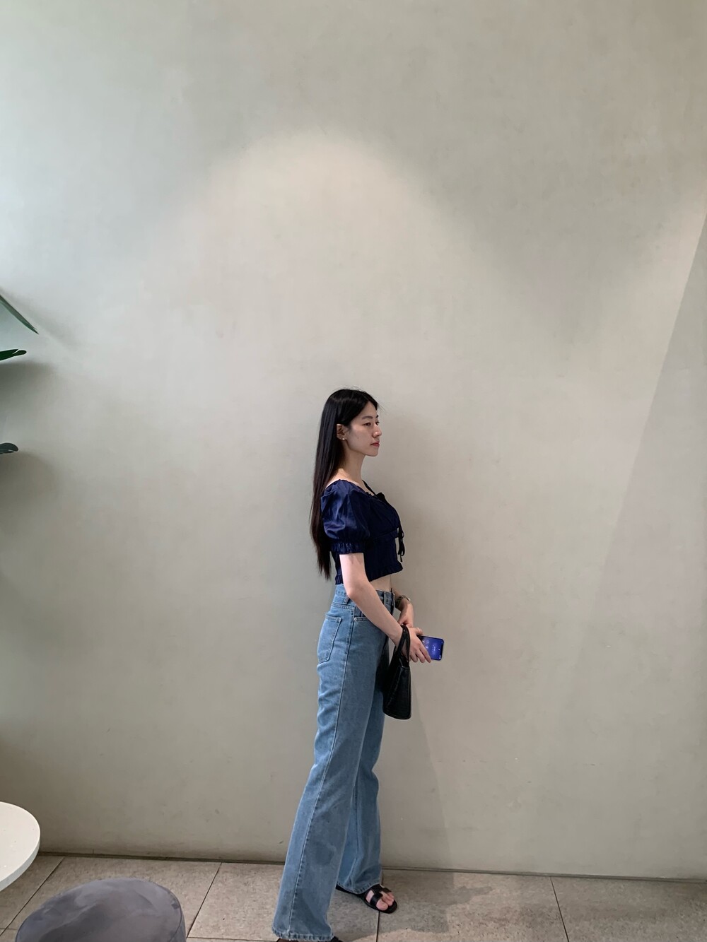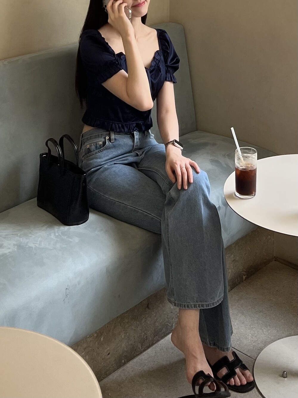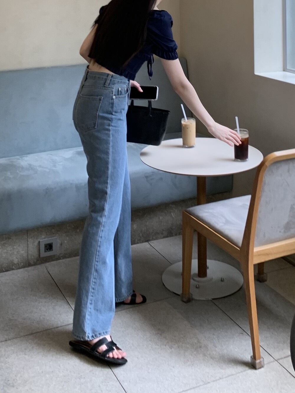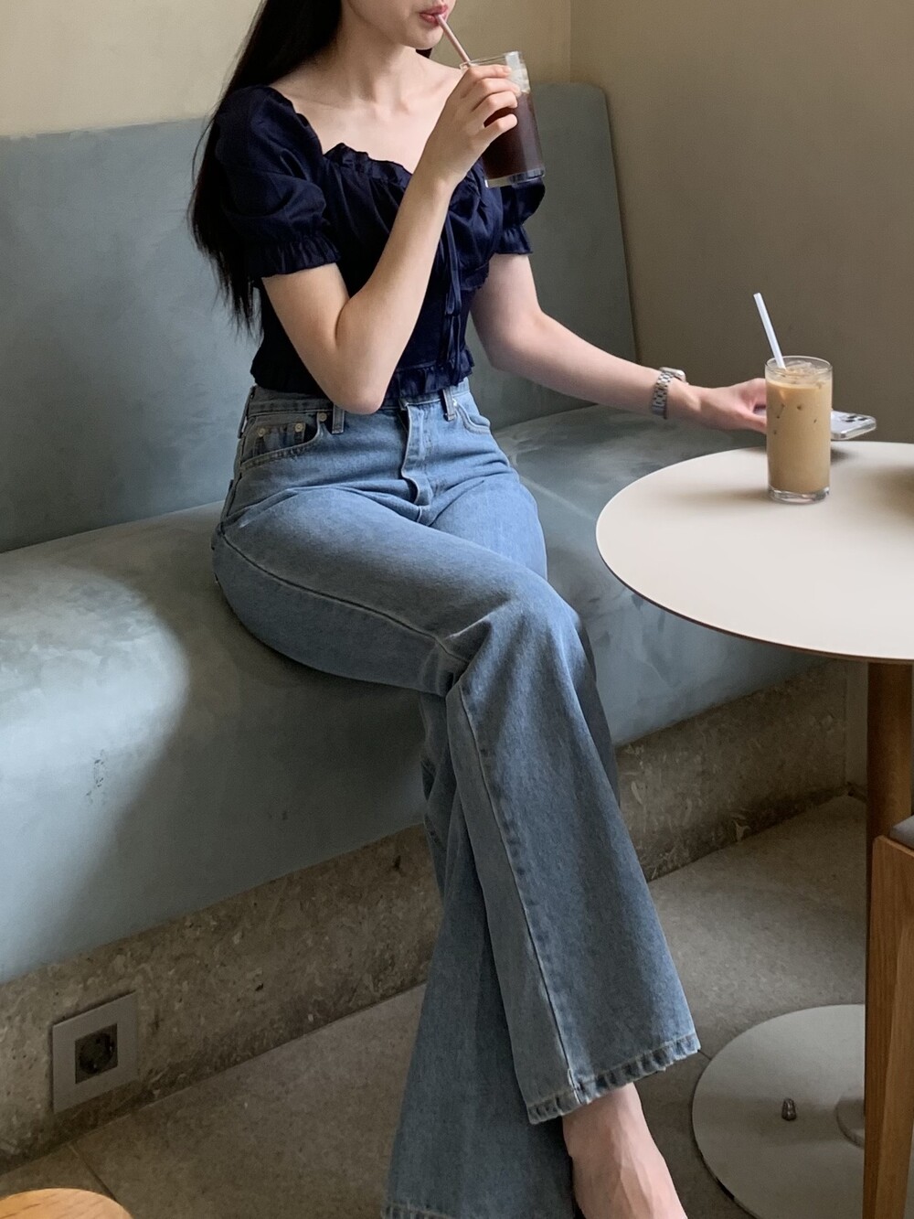 발등까지 길게 떨어지는 핏의 데님입니다.