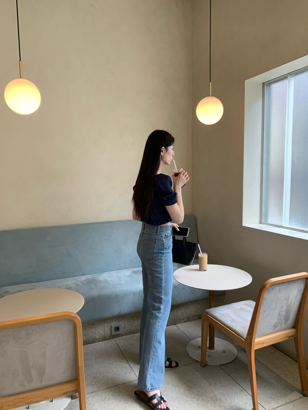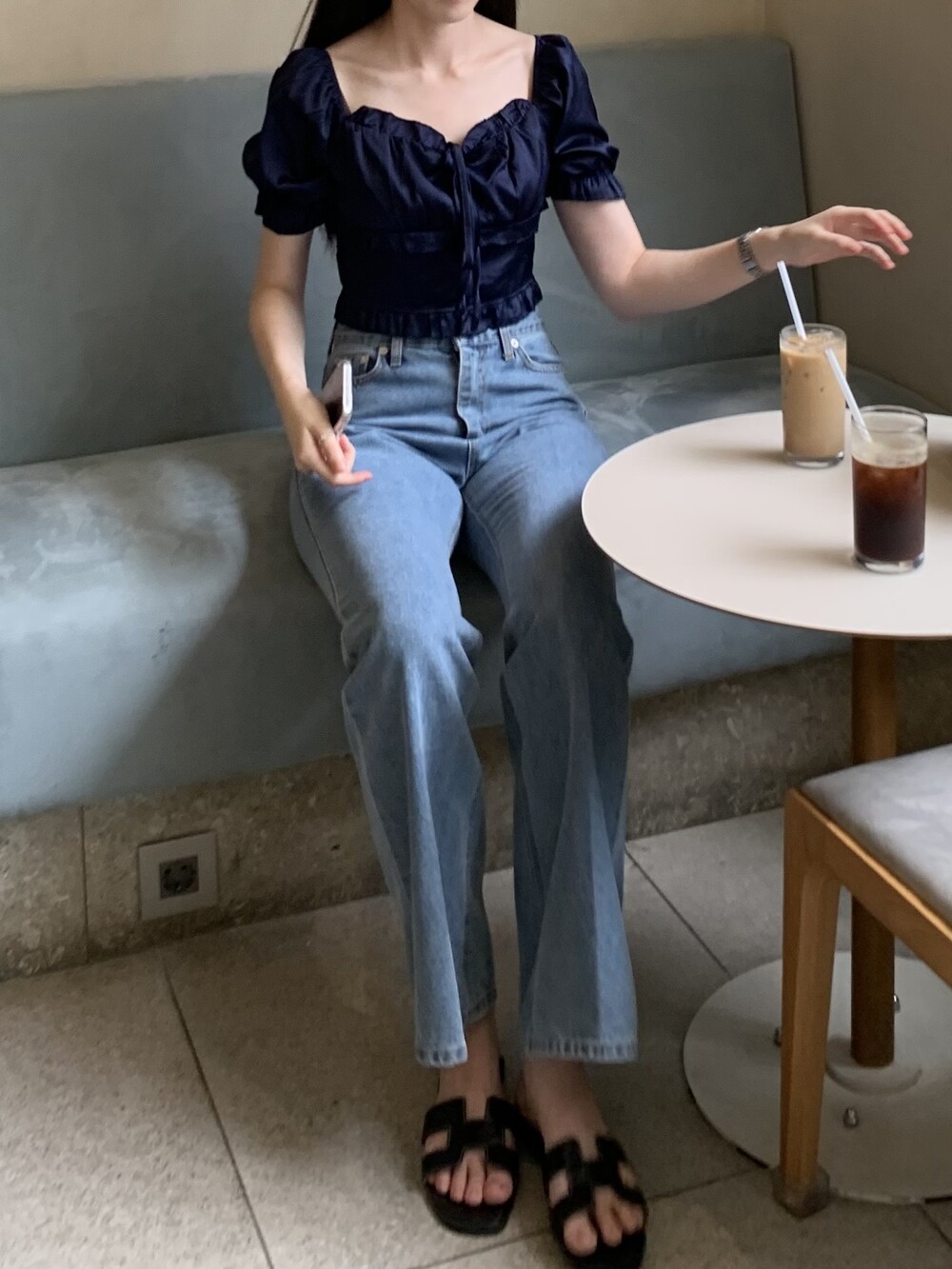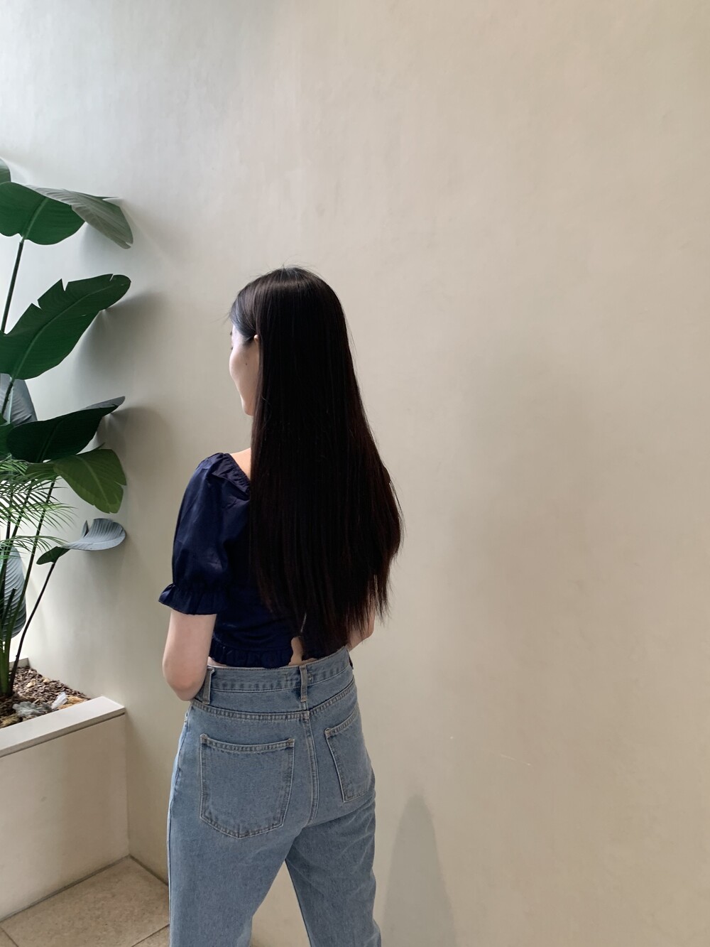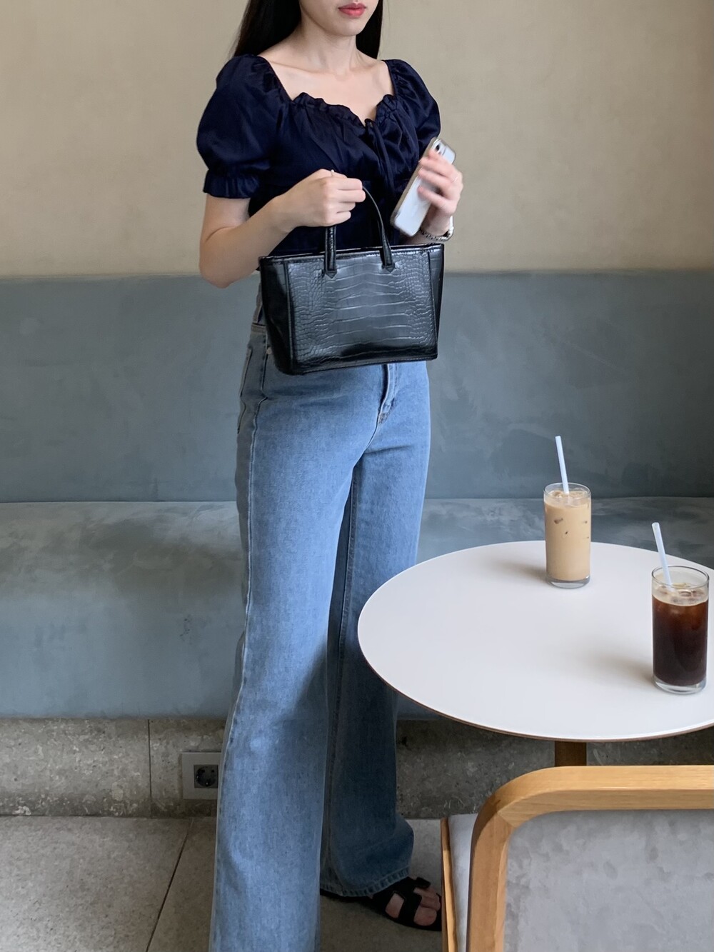 발등까지 길게 떨어지는 핏의 데님입니다.