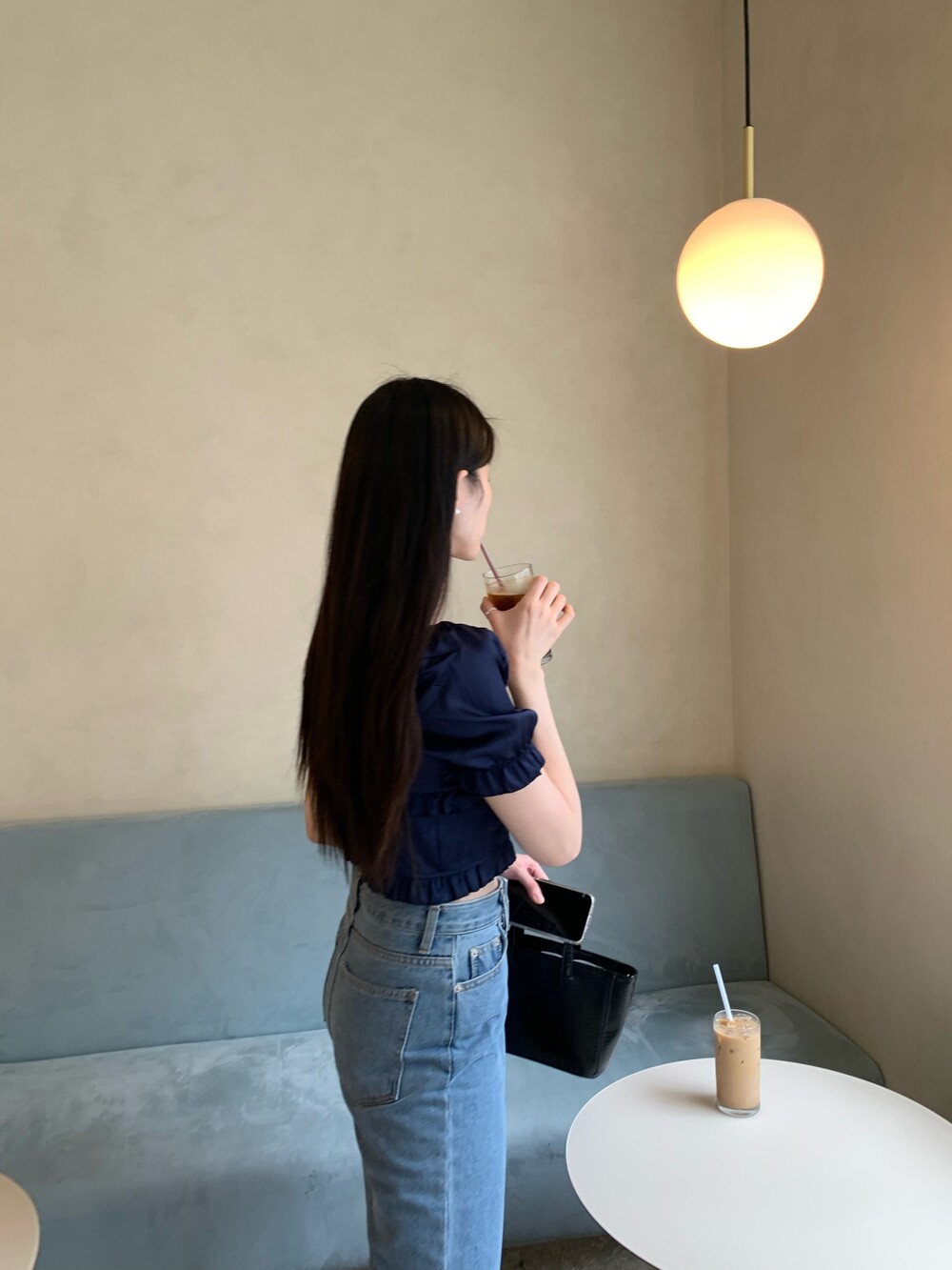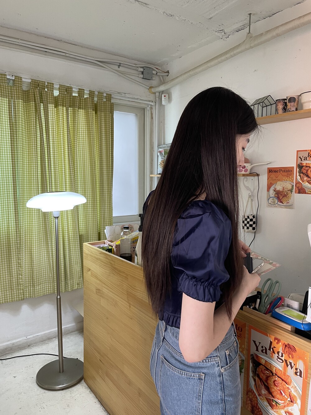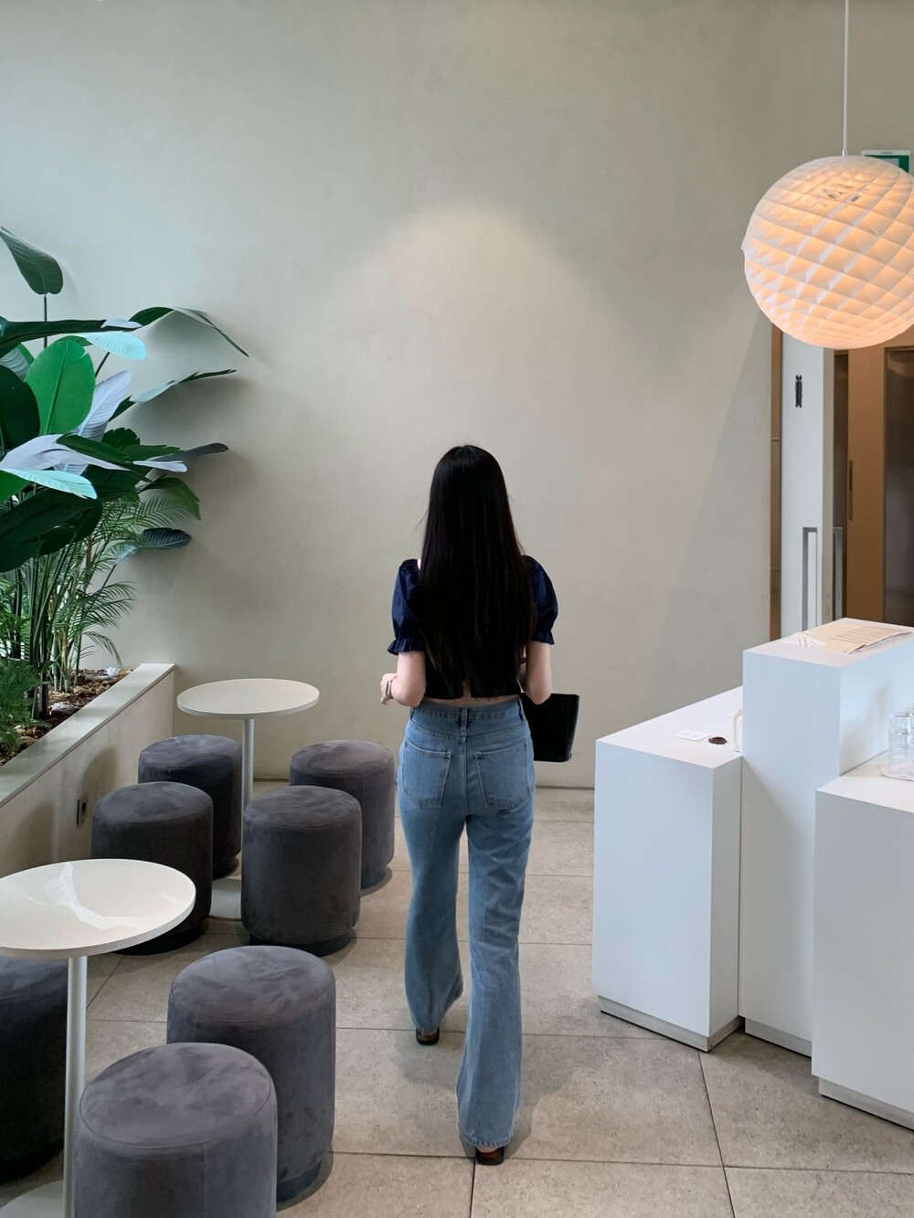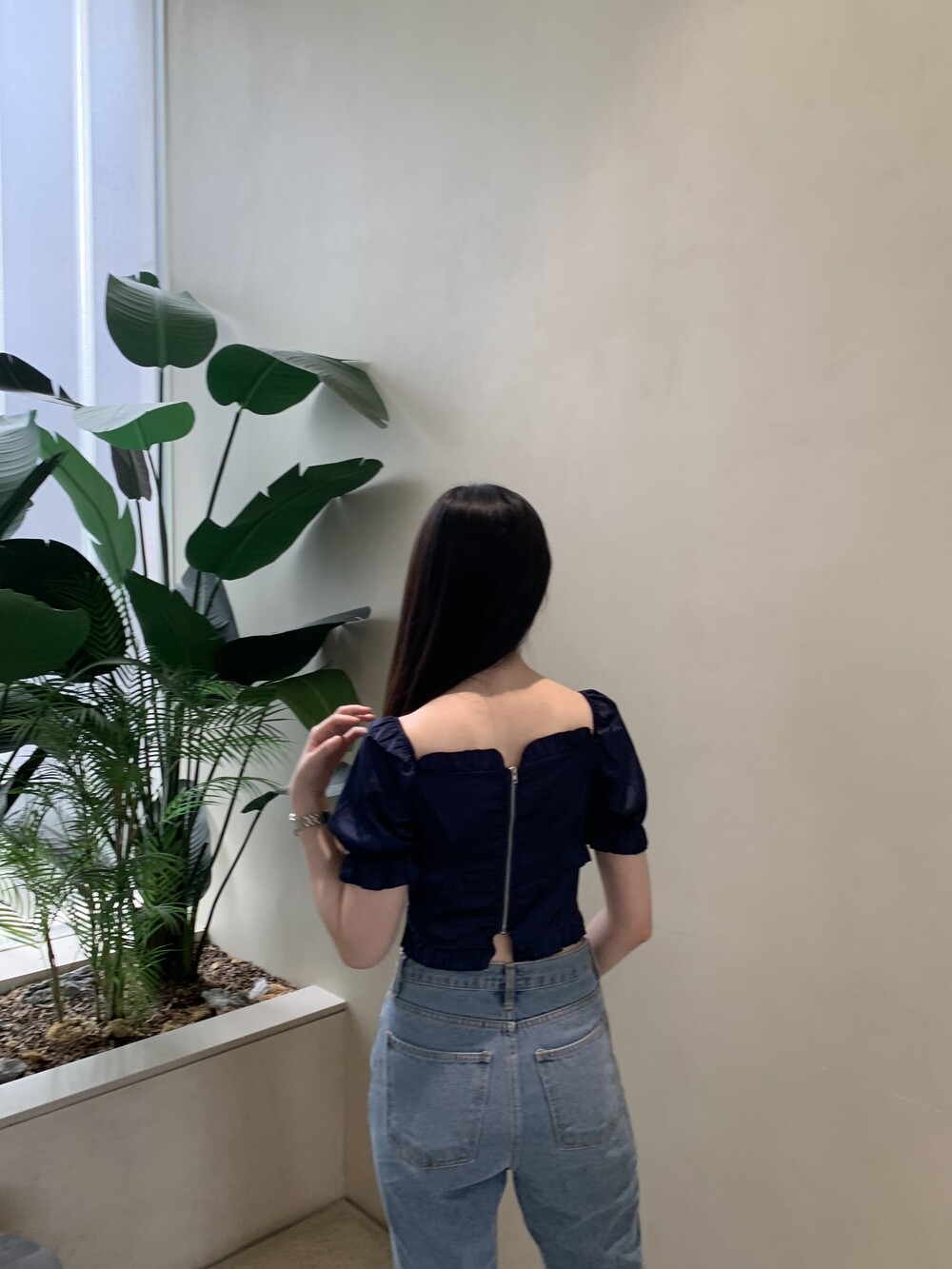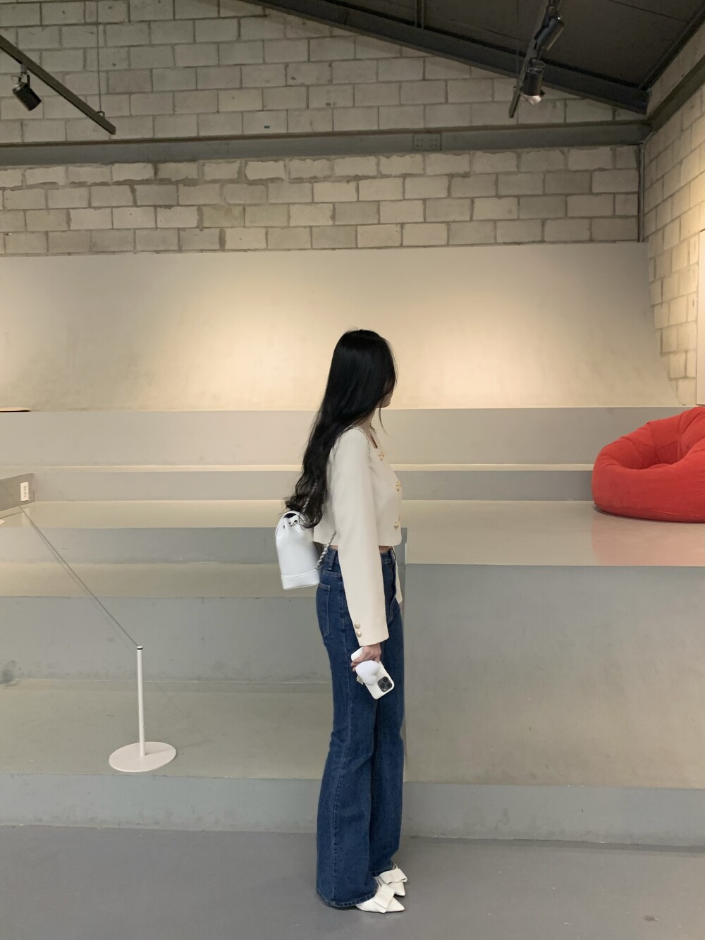 발등까지 길게 떨어지는 핏의 데님입니다.