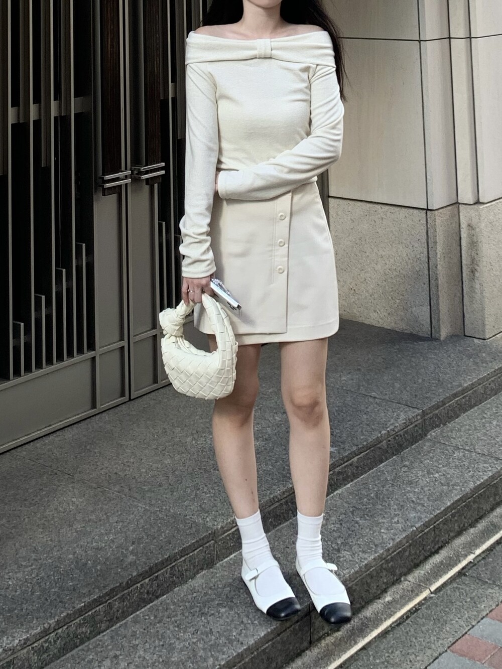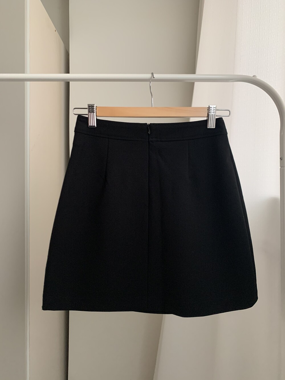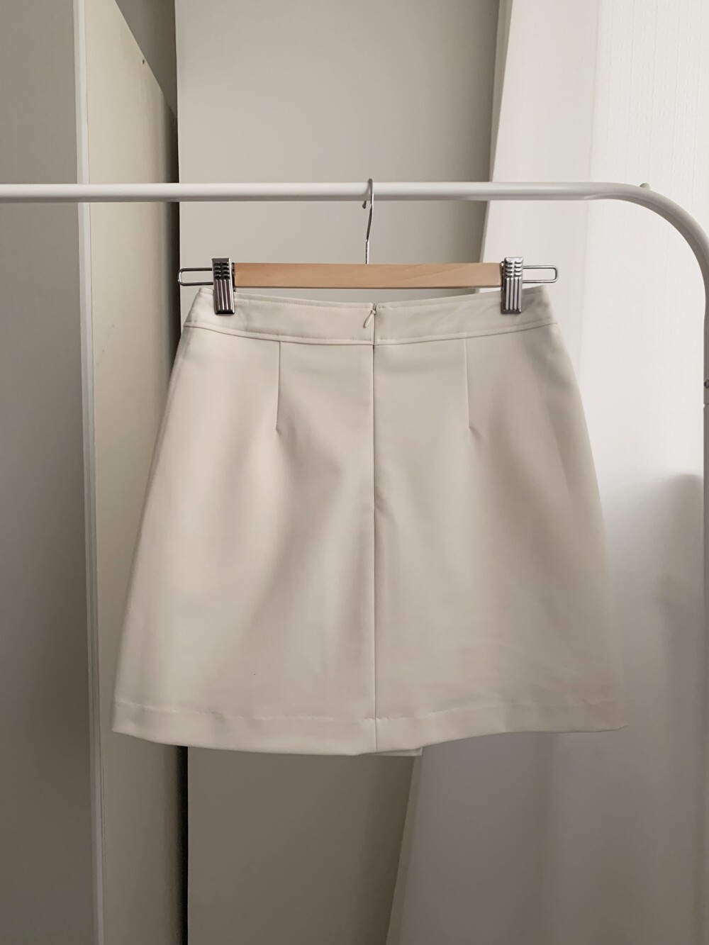 스커트 앞부분의 페이크 단추와 사선으로 떨어지는