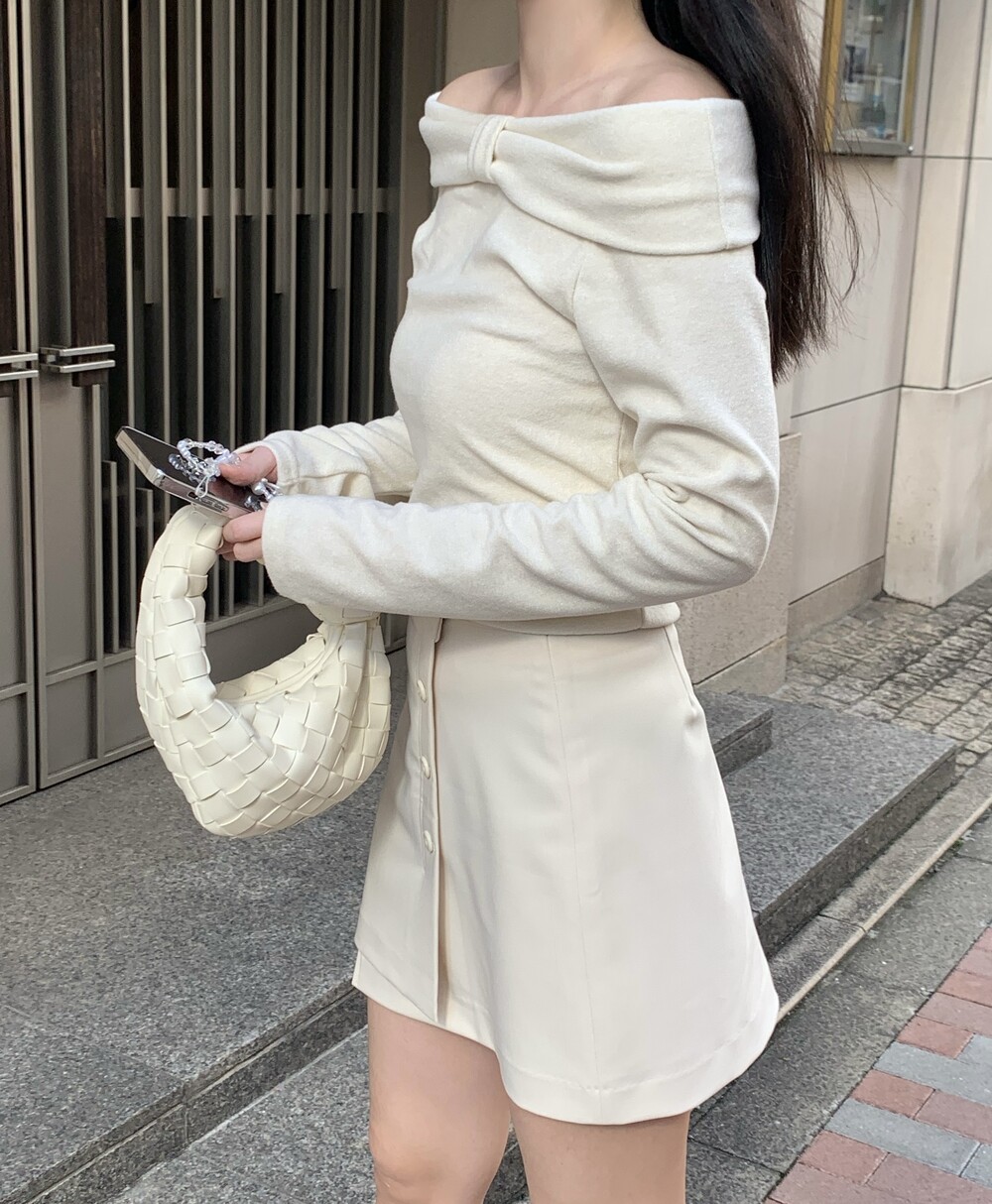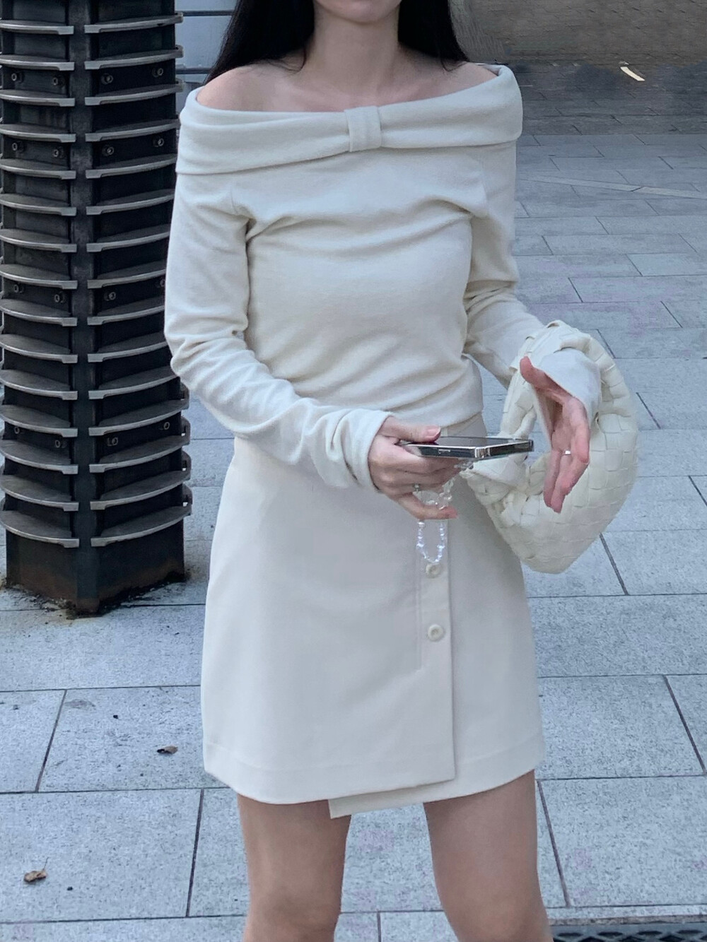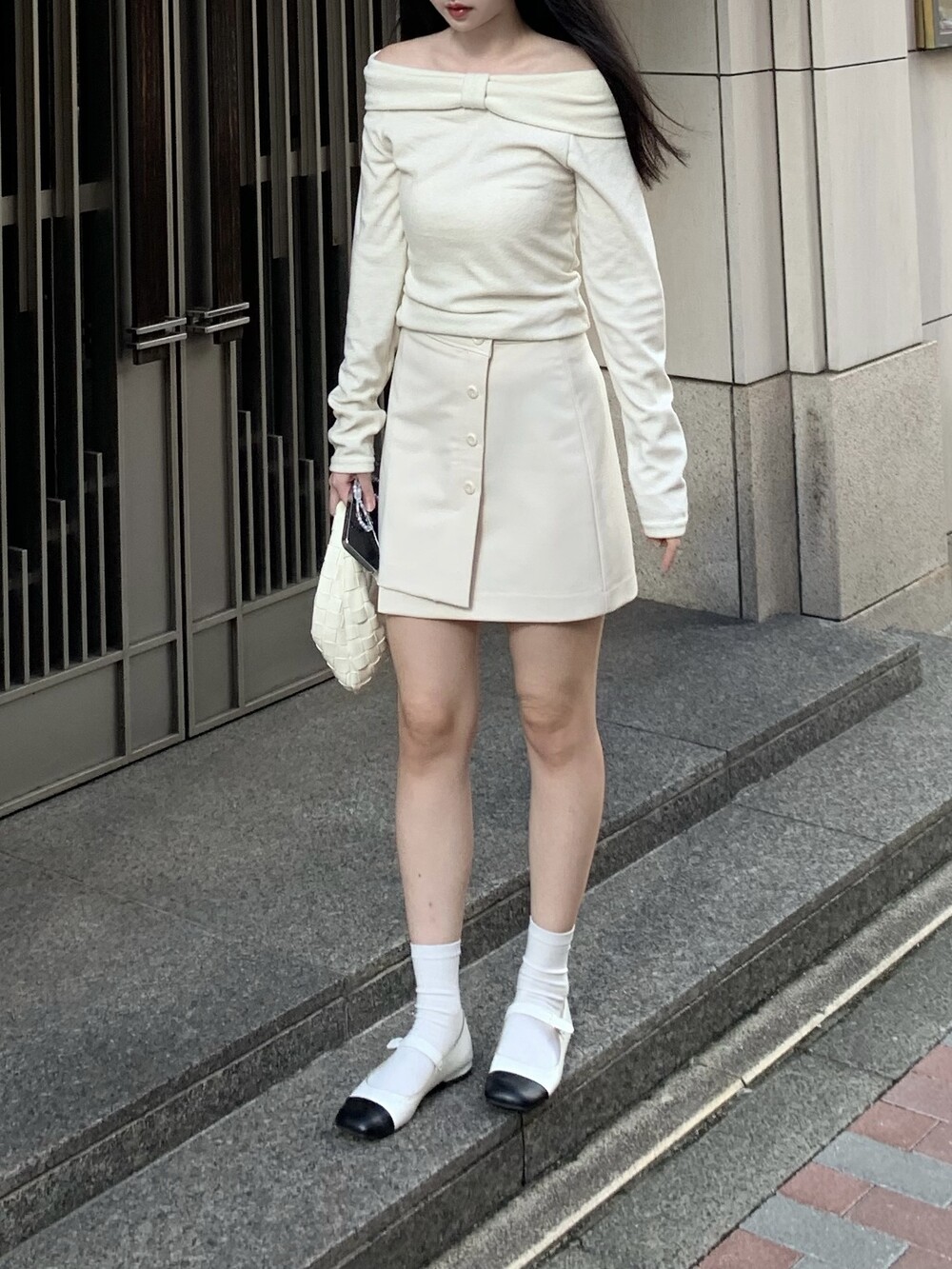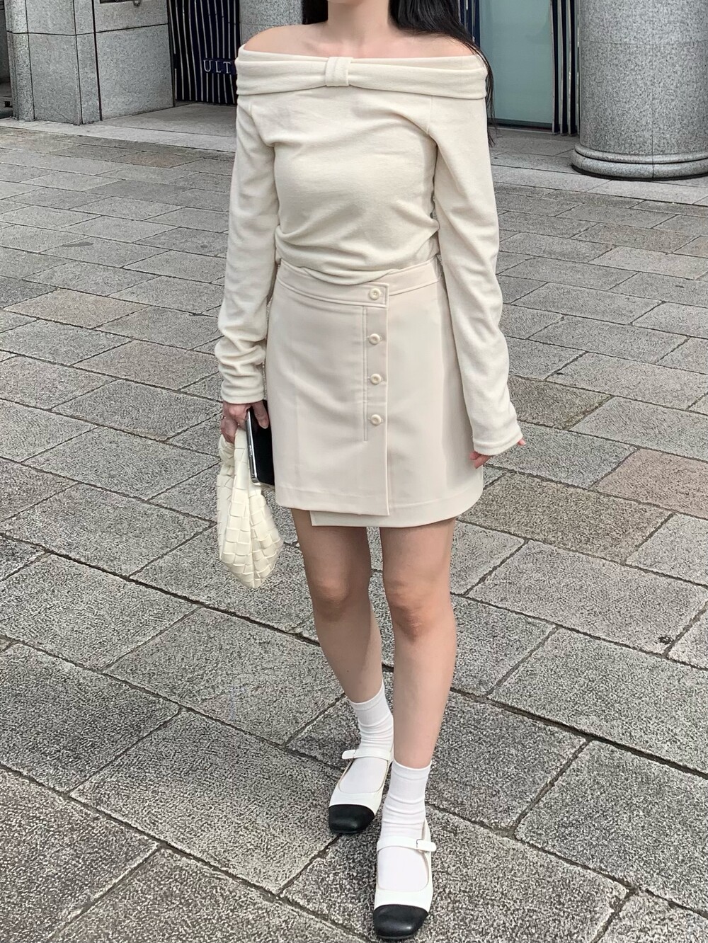 스커트 앞부분의 페이크 단추와 사선으로 떨어지는