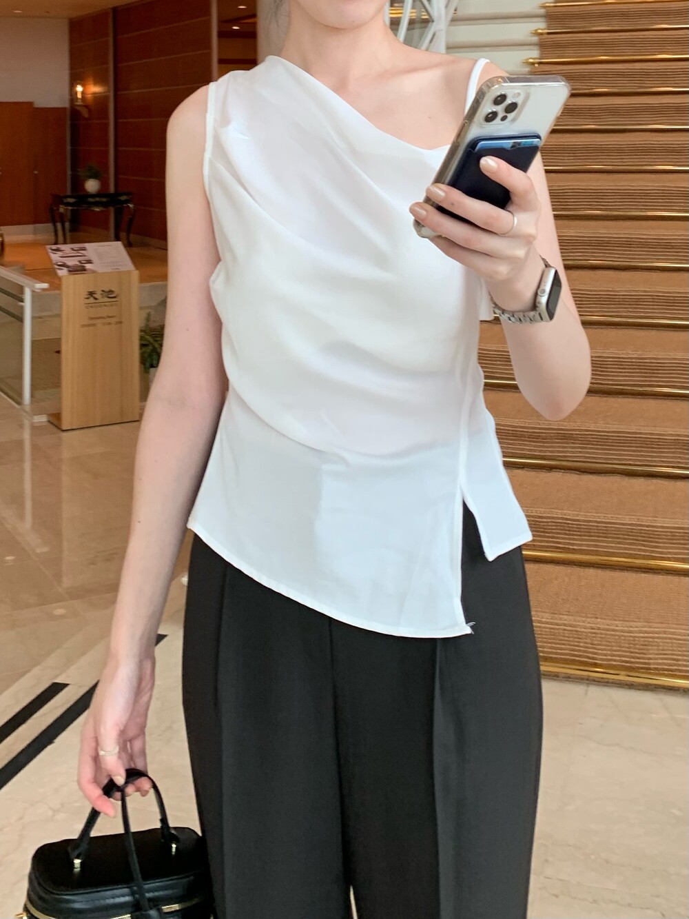 페미닌한 무드의 언발 슬리브리스 블라우스입니다.