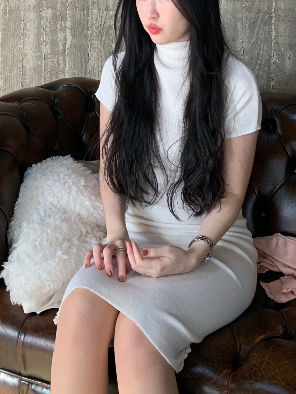 페미닌 무드의 신상 반목 니트 원피스입니다.