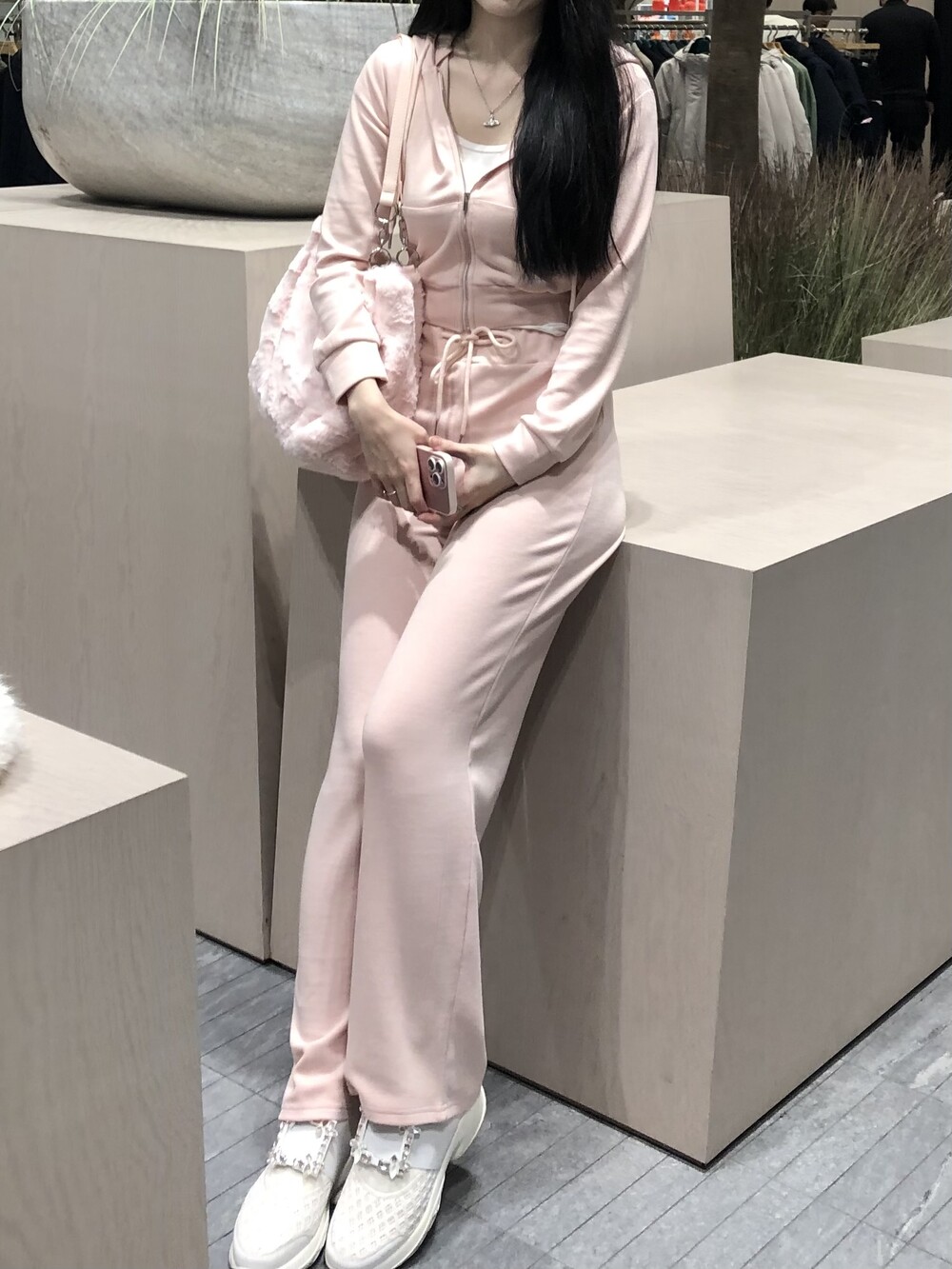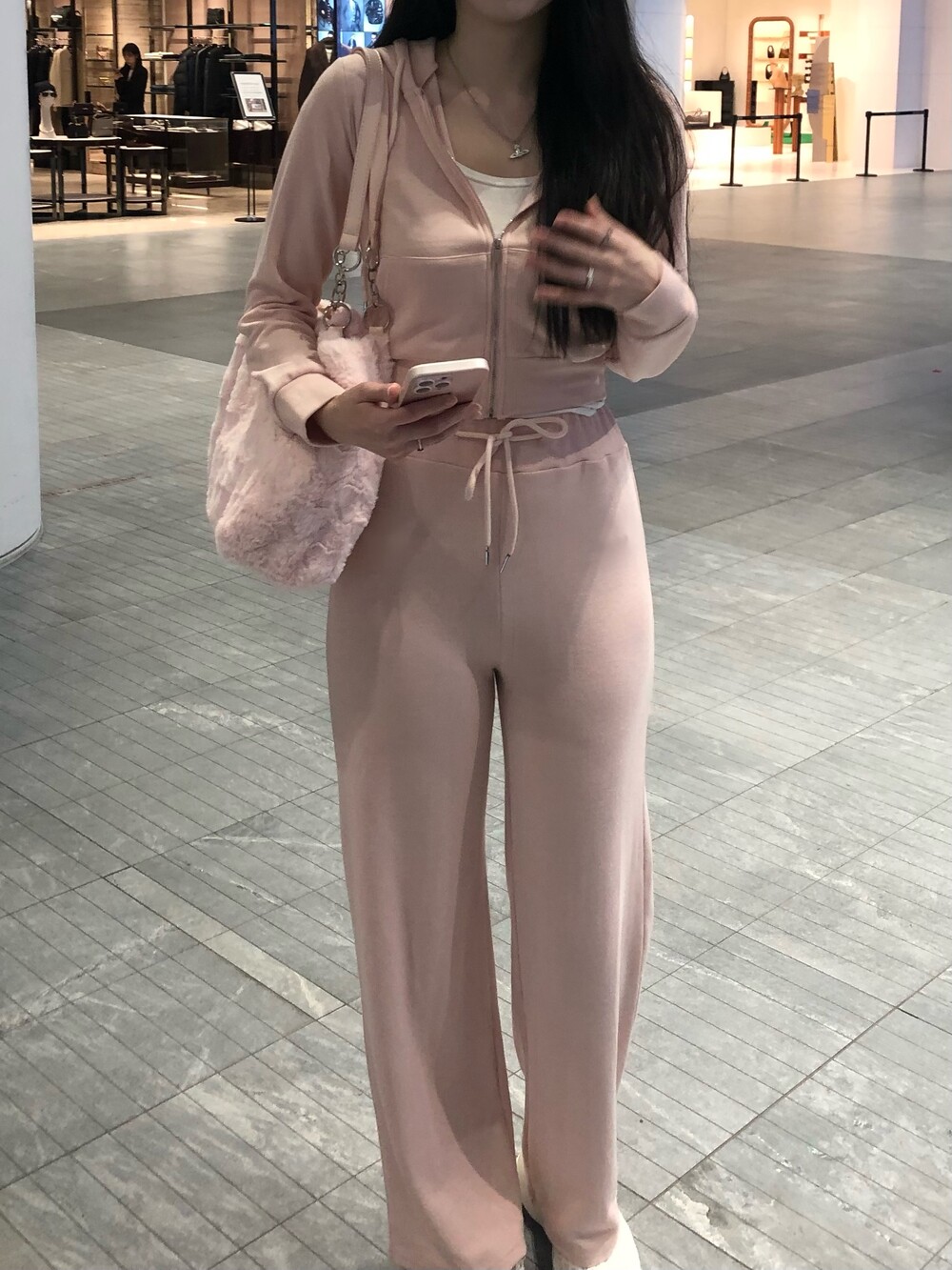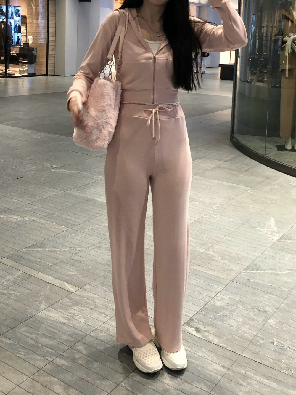 후드 집업과 와이드 팬츠로 편안한 착용감이에요.