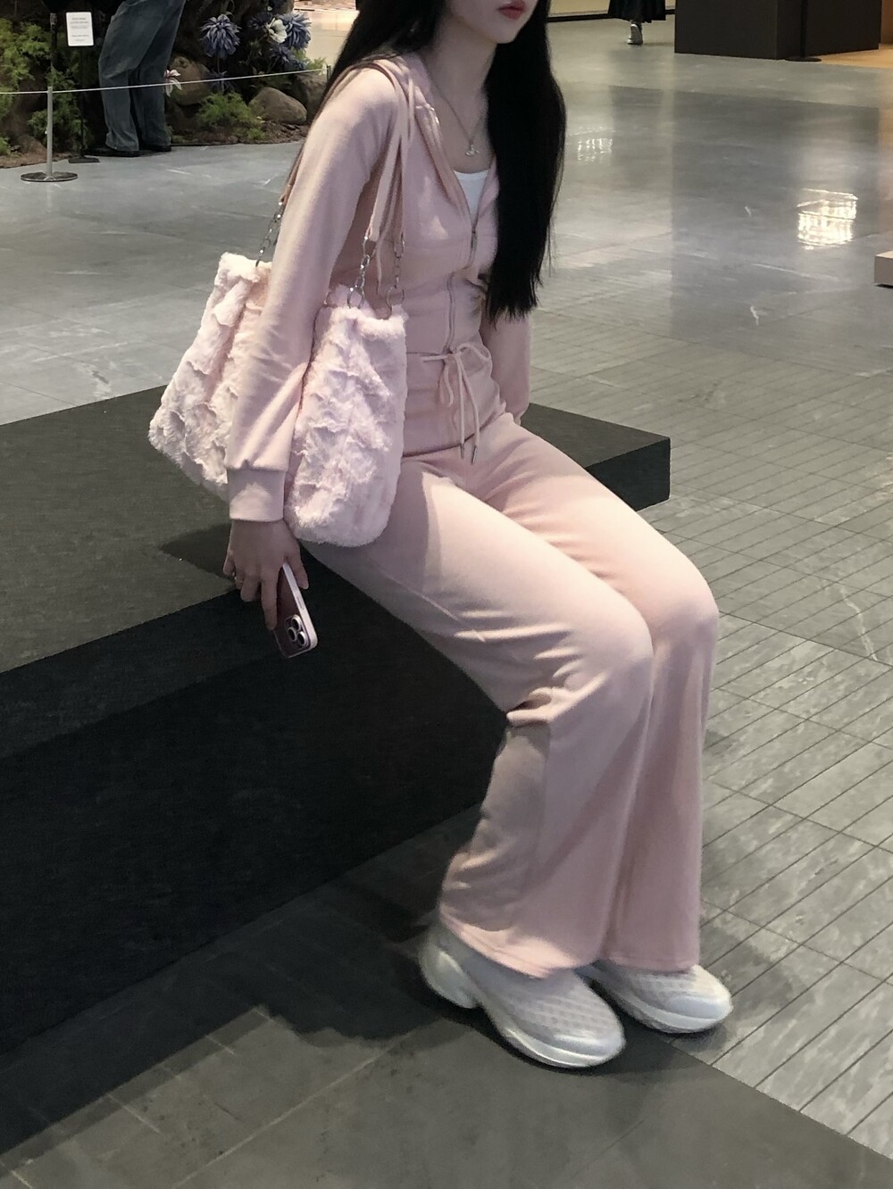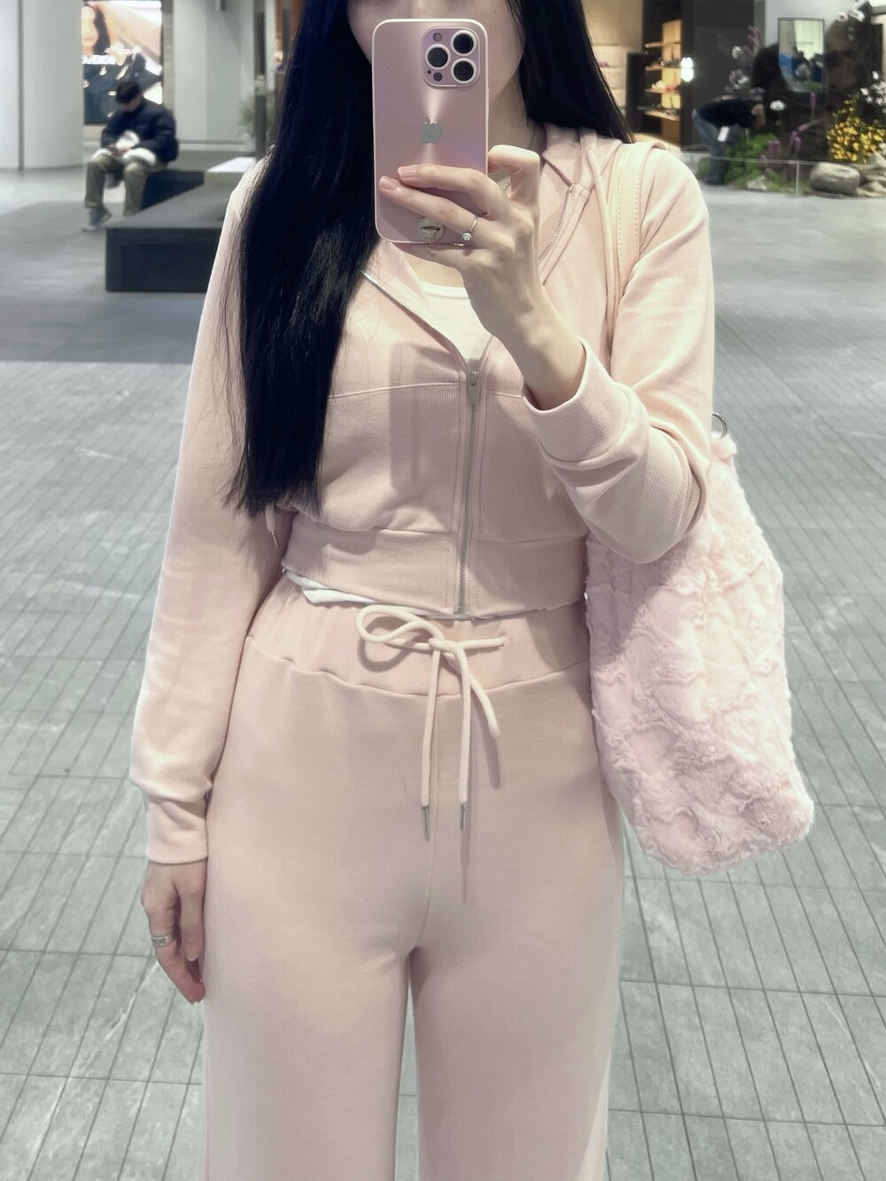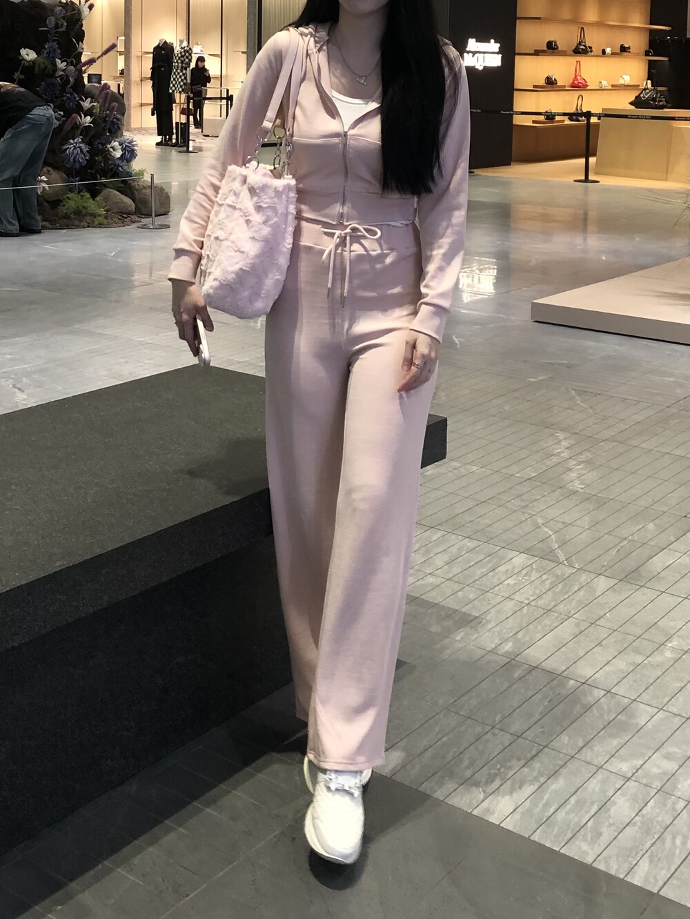 후드 집업과 와이드 팬츠로 편안한 착용감이에요.
