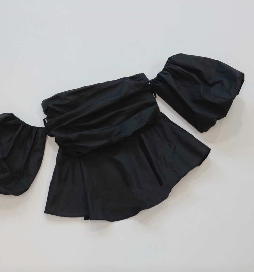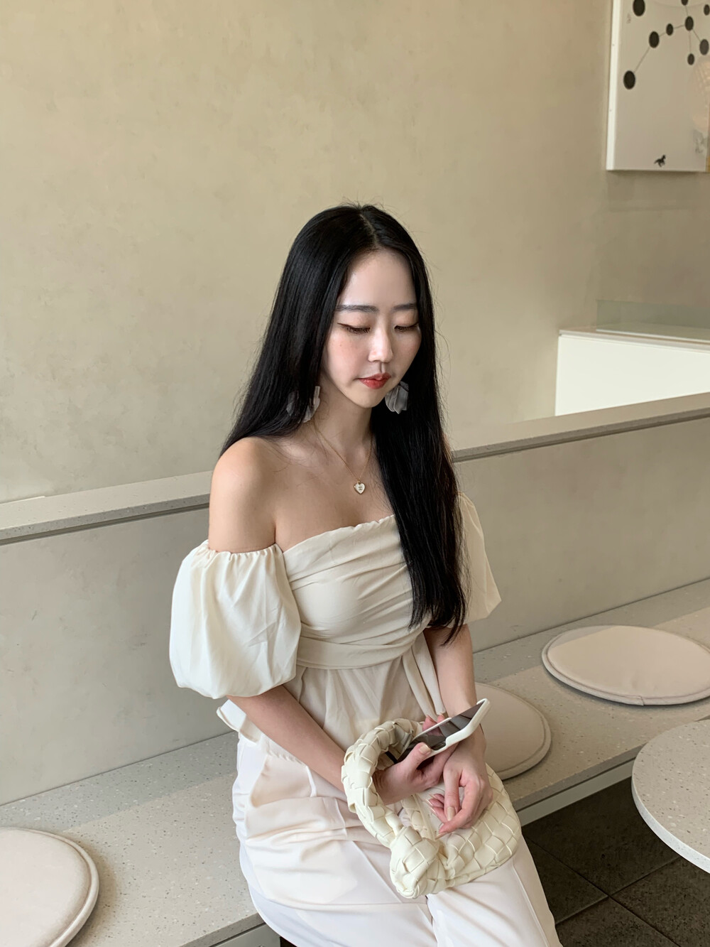 팔뚝을 가려주는 퍼프 소매 디테일이 포인트에요.