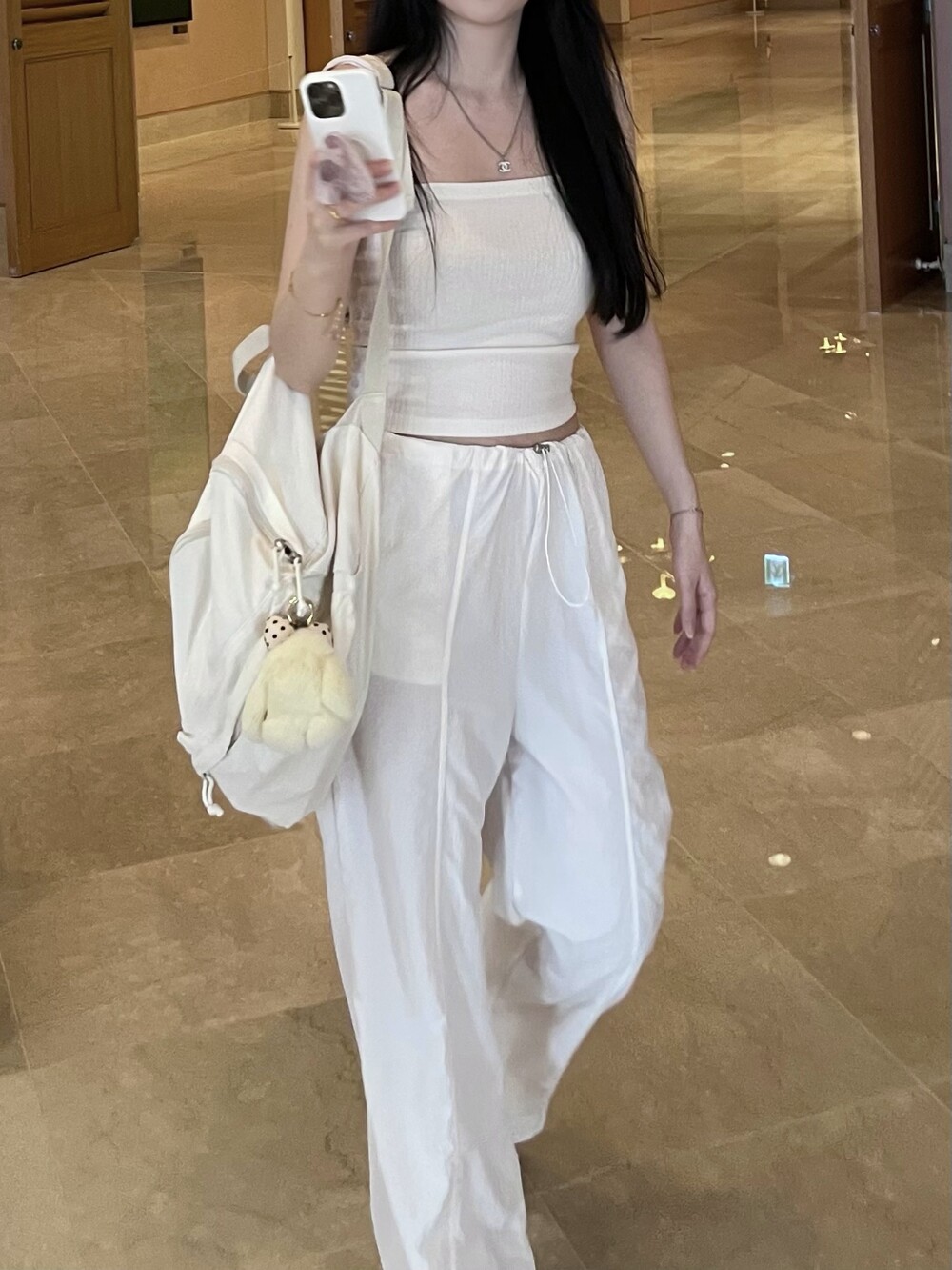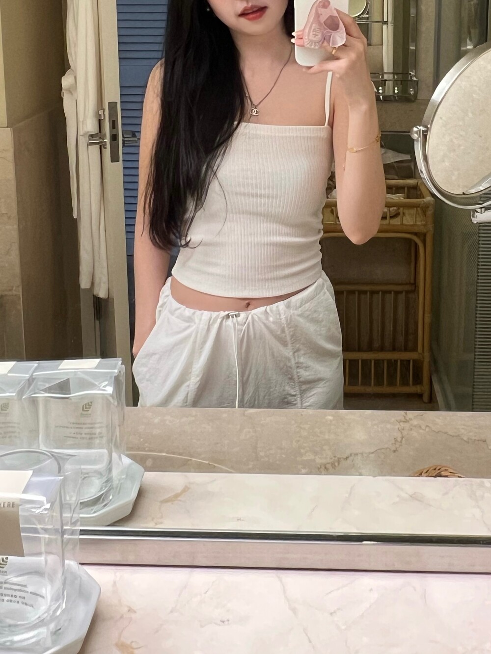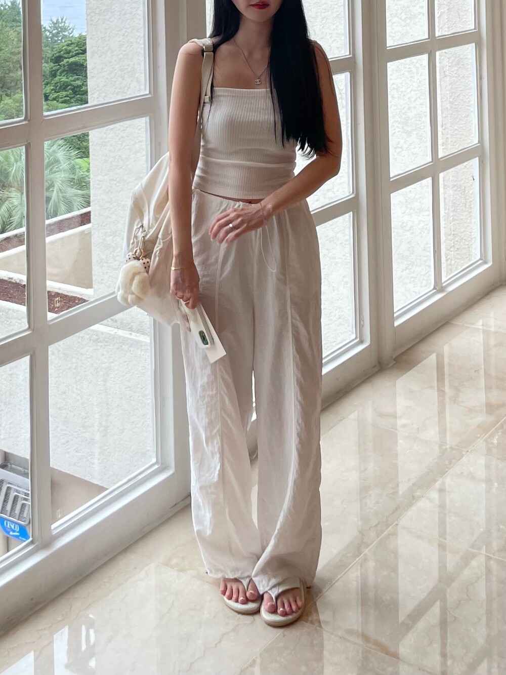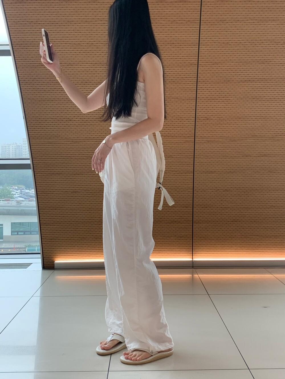 바지 밑단은 스트링 디테일로 조절 가능합니다.
