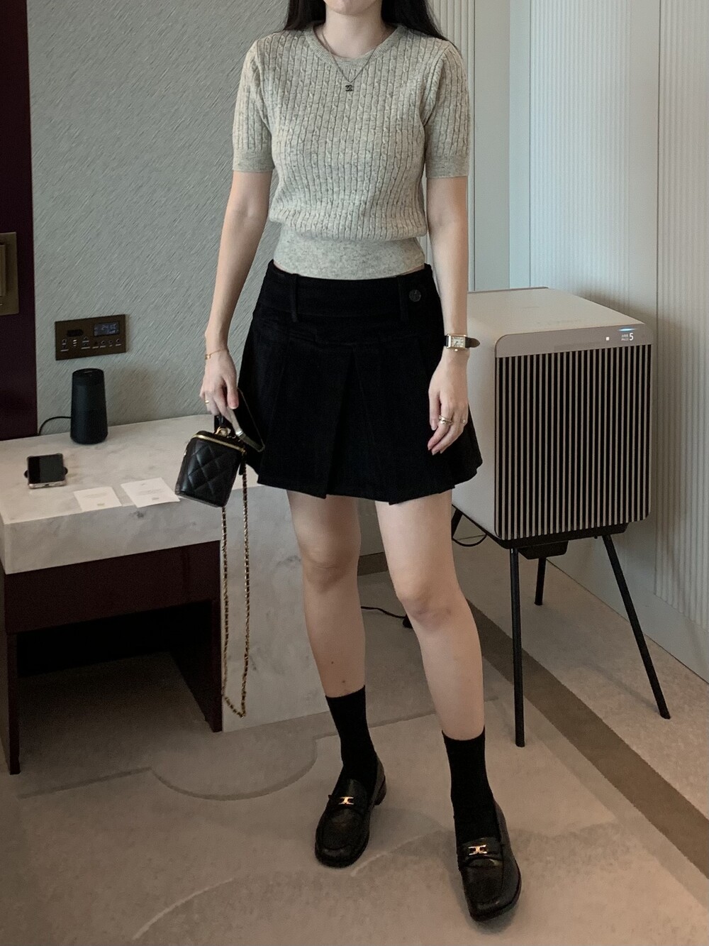 금장 버튼이 포인트이며 얼굴이 작아보이는 핏이에요.