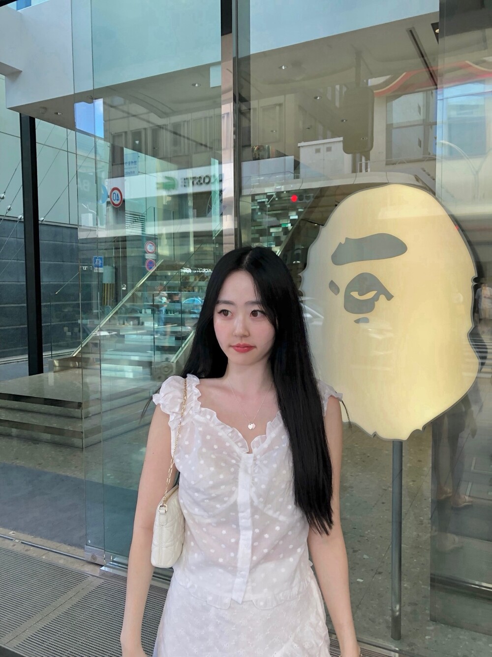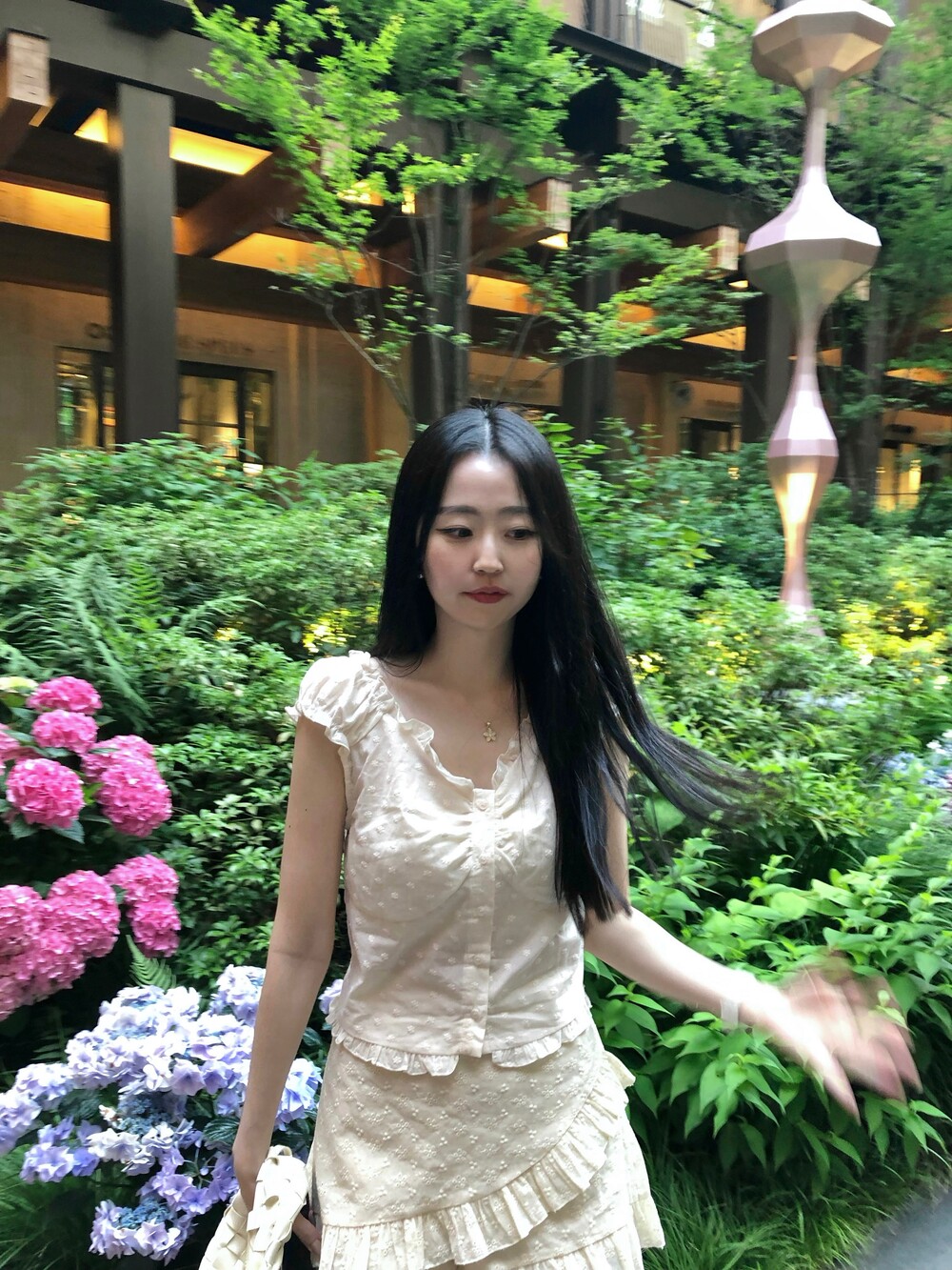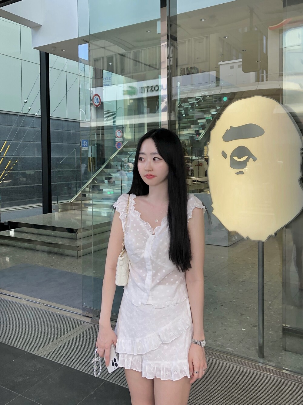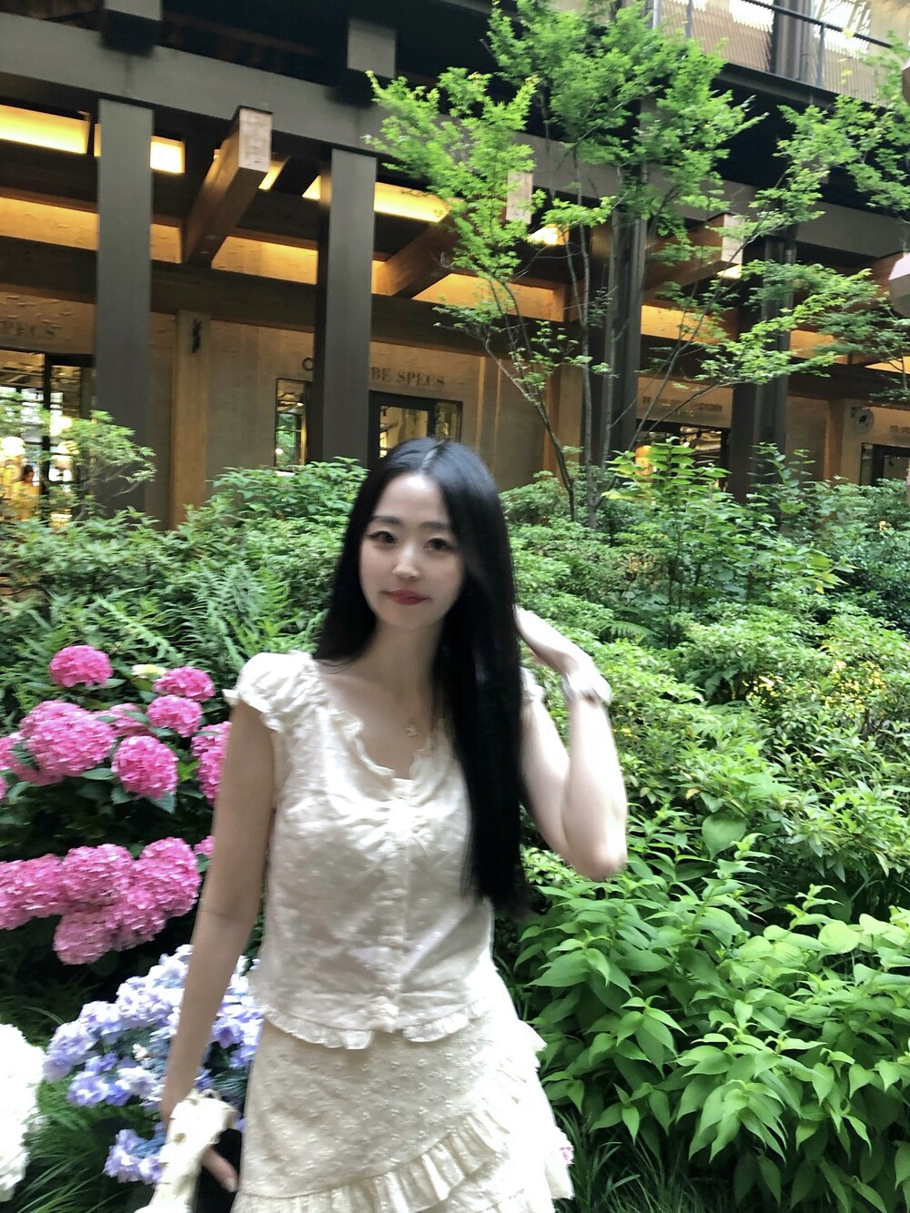함께 코디한 플라워 블라우스와 셋업 착용을 추천드려요.