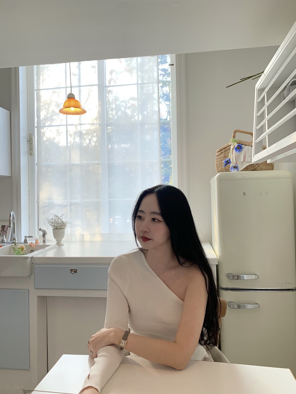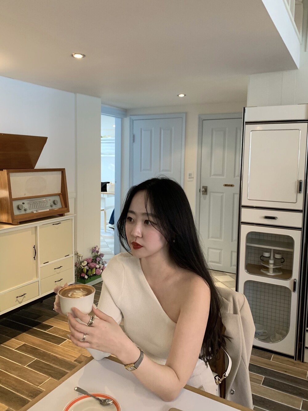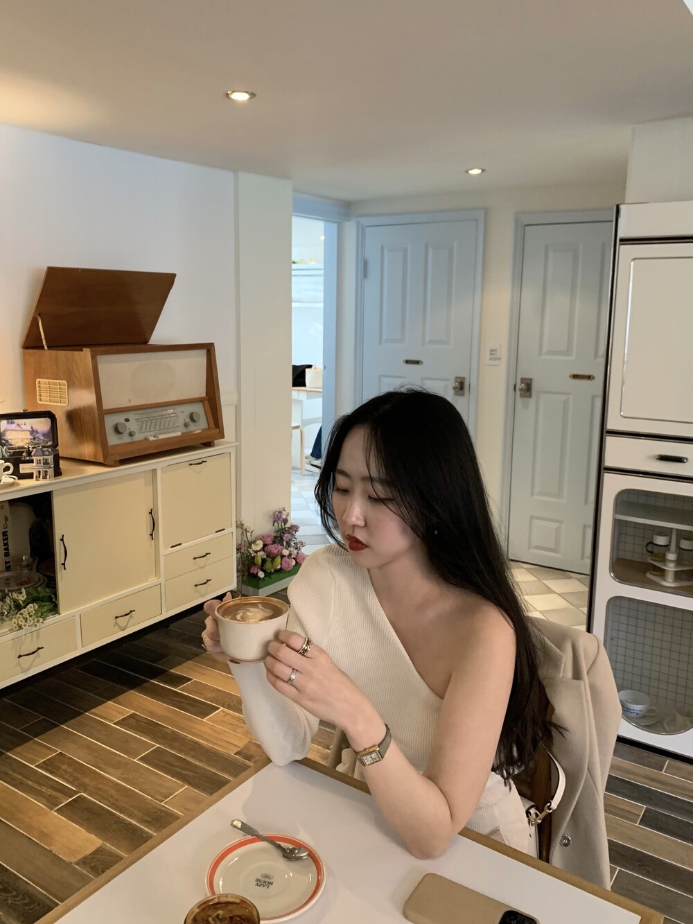 우아한 무드의 신상 원숄더 티셔츠 입니다.