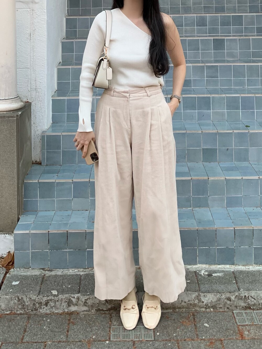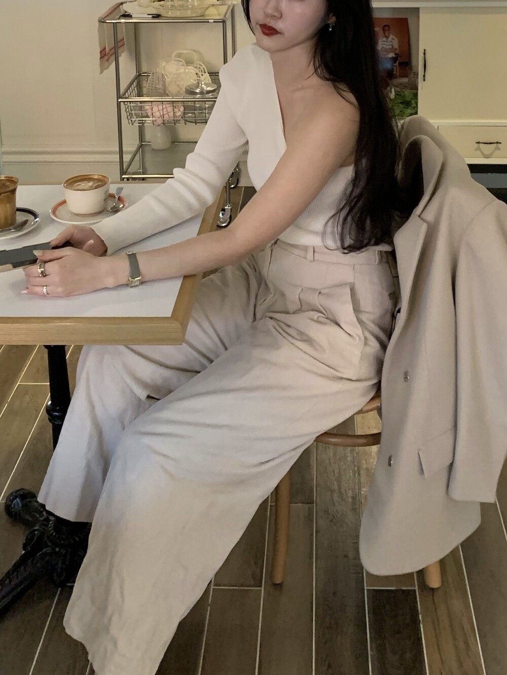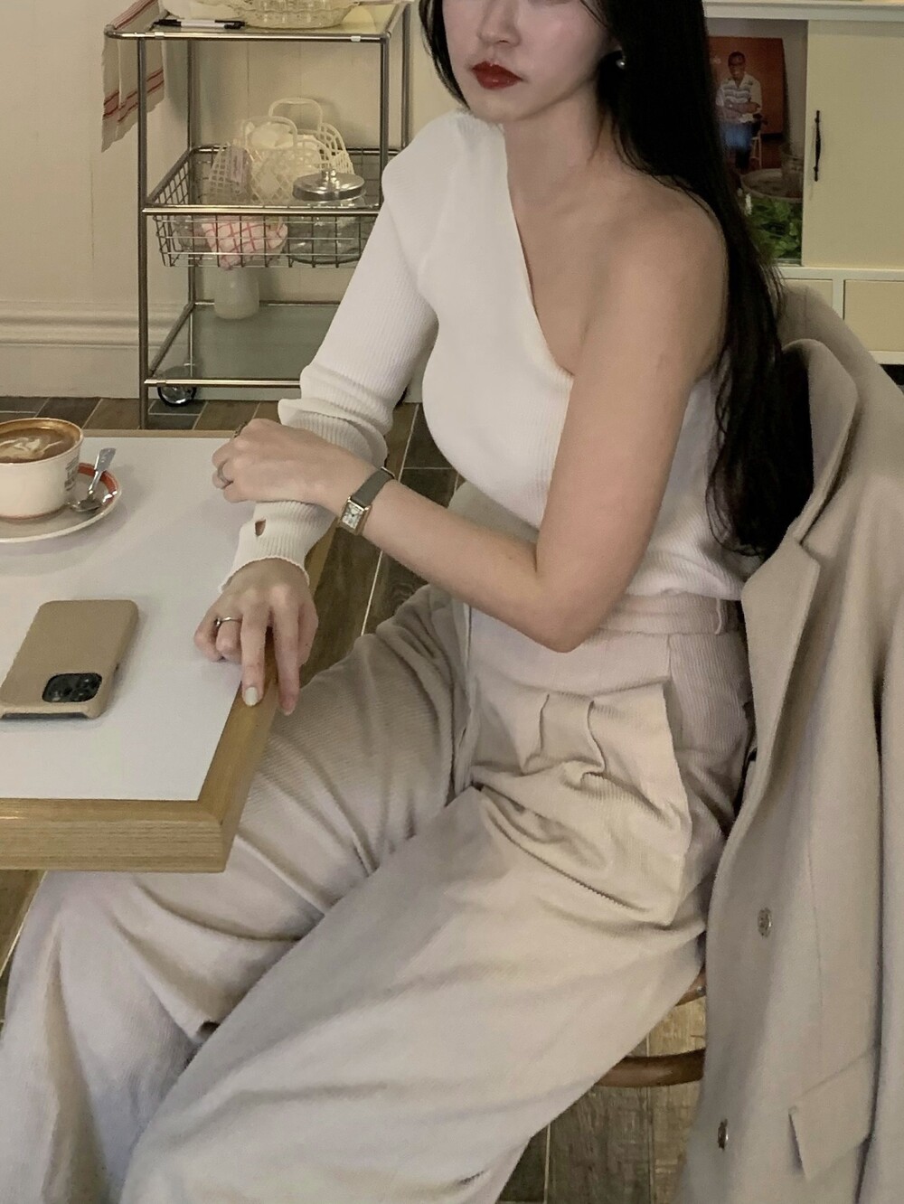 언발란스한 사선 숄더 라인이 포인트이며