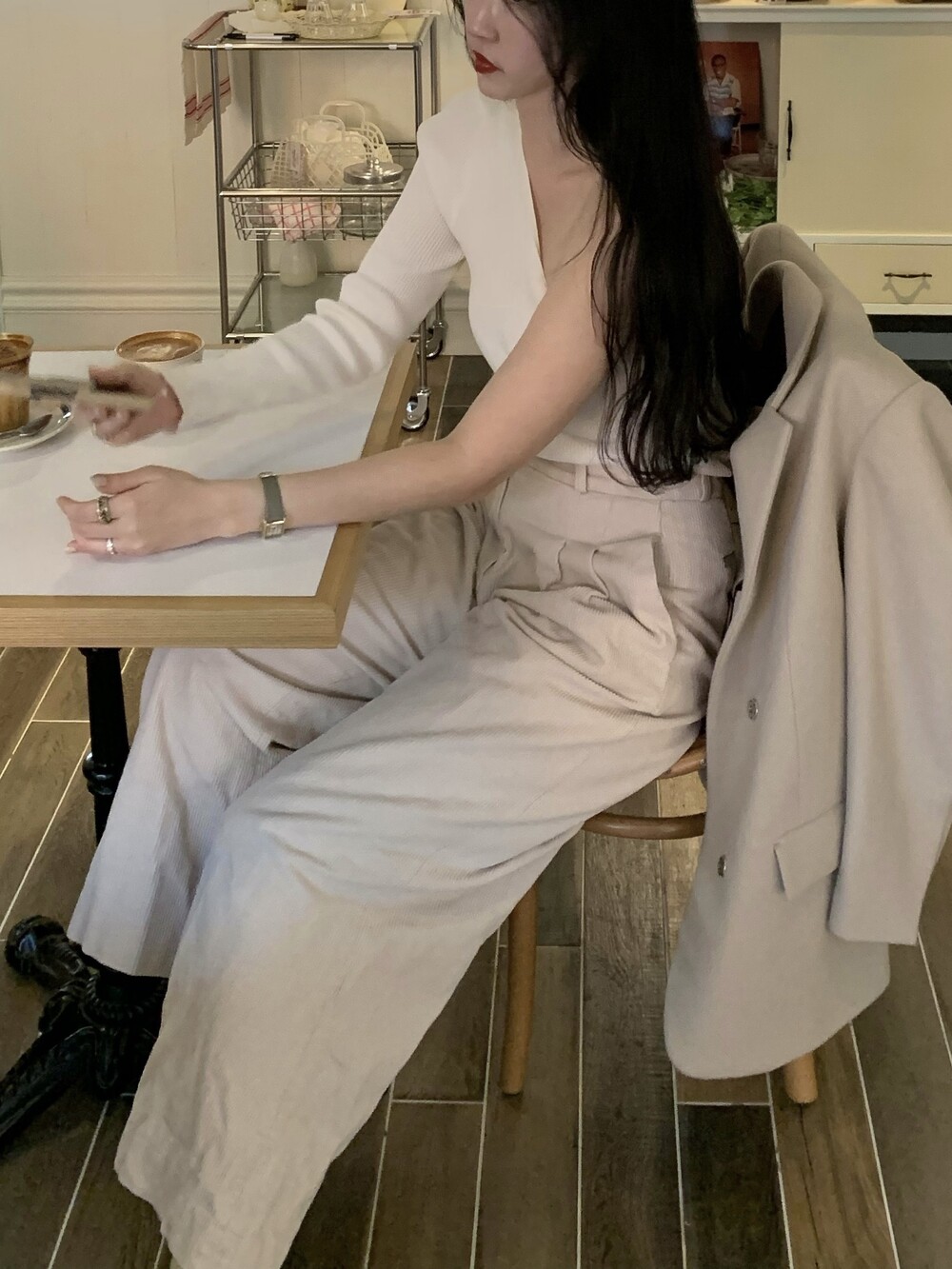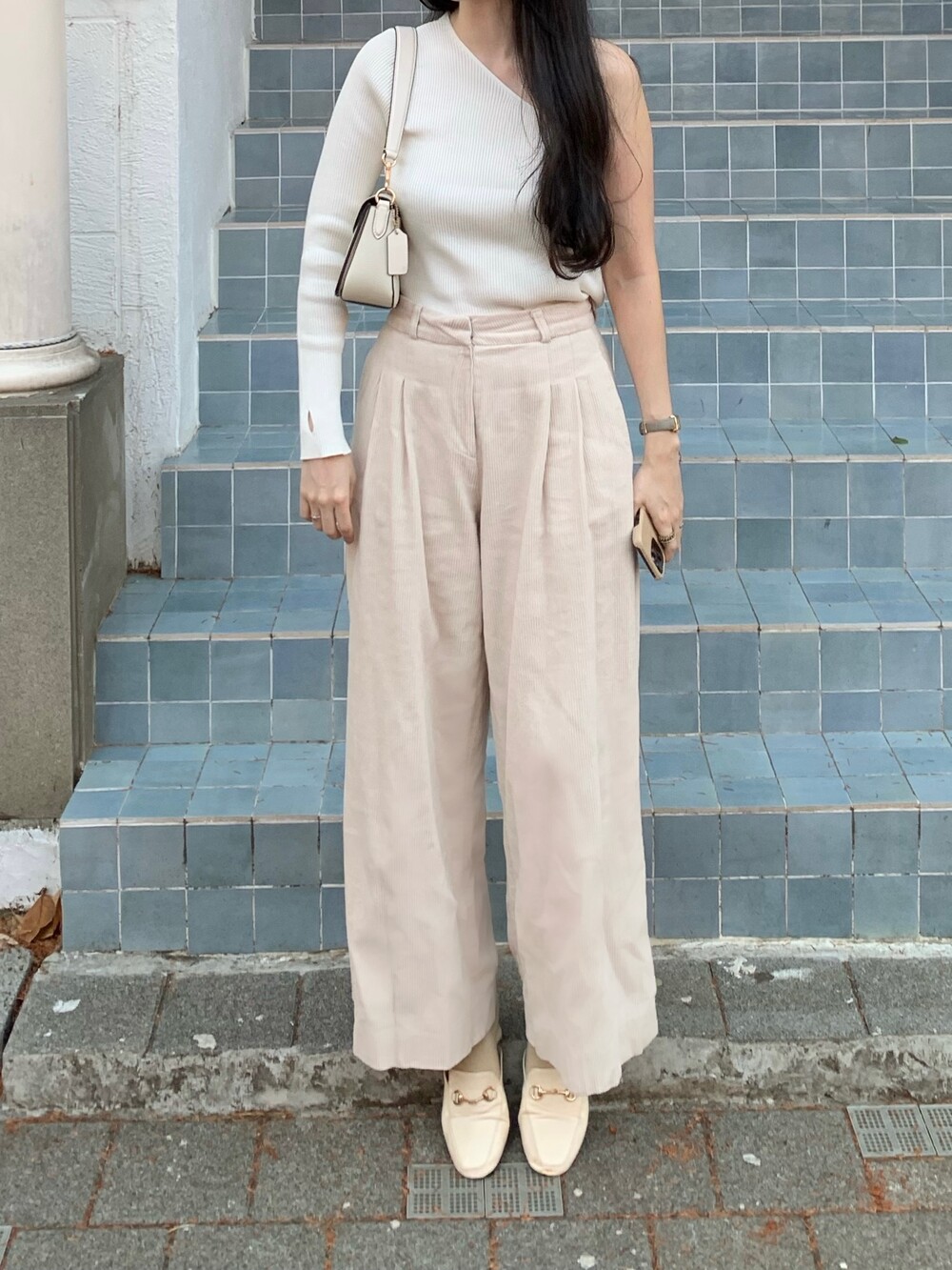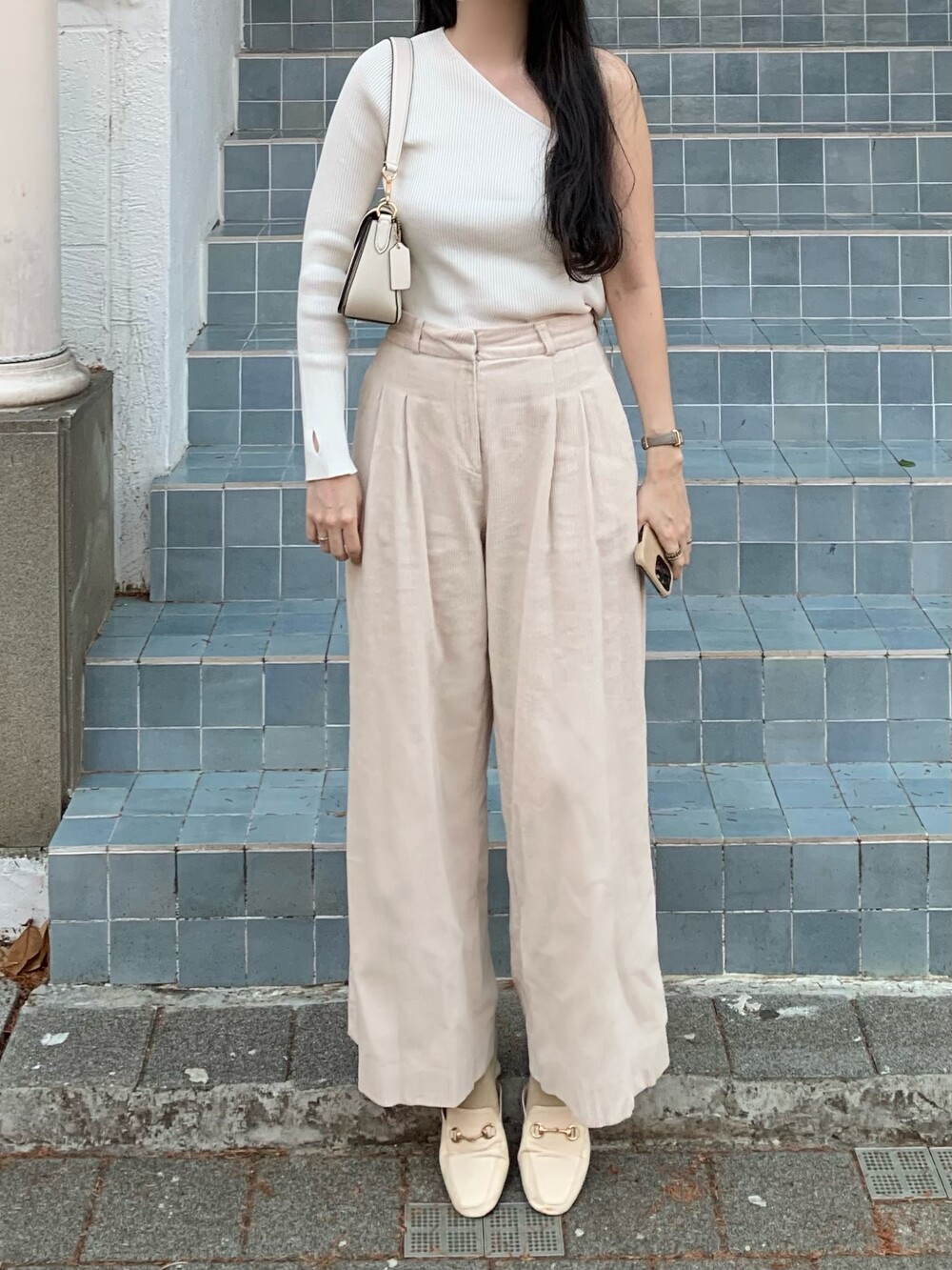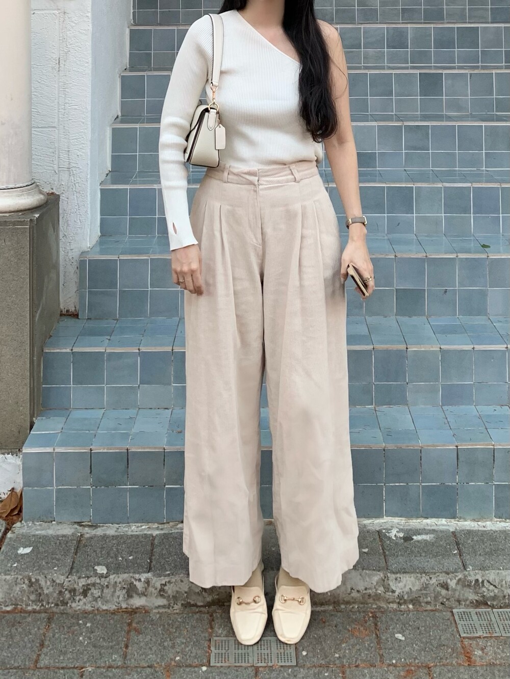 언발란스한 사선 숄더 라인이 포인트이며
